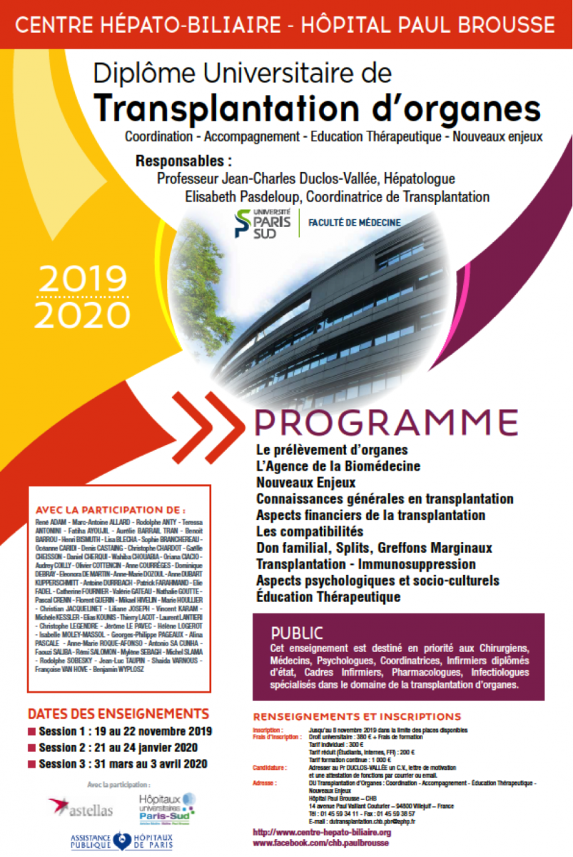 D.U. Transplantation d'Organes : Coordination, Accompagnement, Education thérapeutique En présentiel et en distancielLieu de formation : Centre Hépato-Biliaire (Villejuif) Resp.: Mr Gaël BERTHELOT, Pr. Jean-Charles DUCLOS-VALLÉE, Dr. Daniel PIETRASZ, Mr Thomas BREARD, Mme Elise GOYON Voir le programme 2025-2026 - PDF Fin des inscriptions : 15 nov. 2025